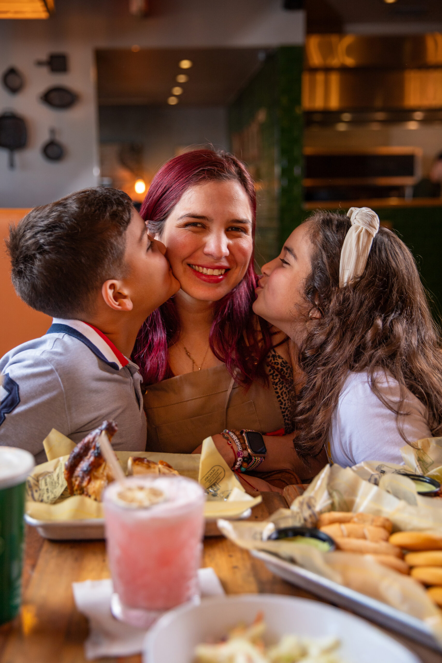Two children kiss a smiling woman at a restaurant table with food in front of them.