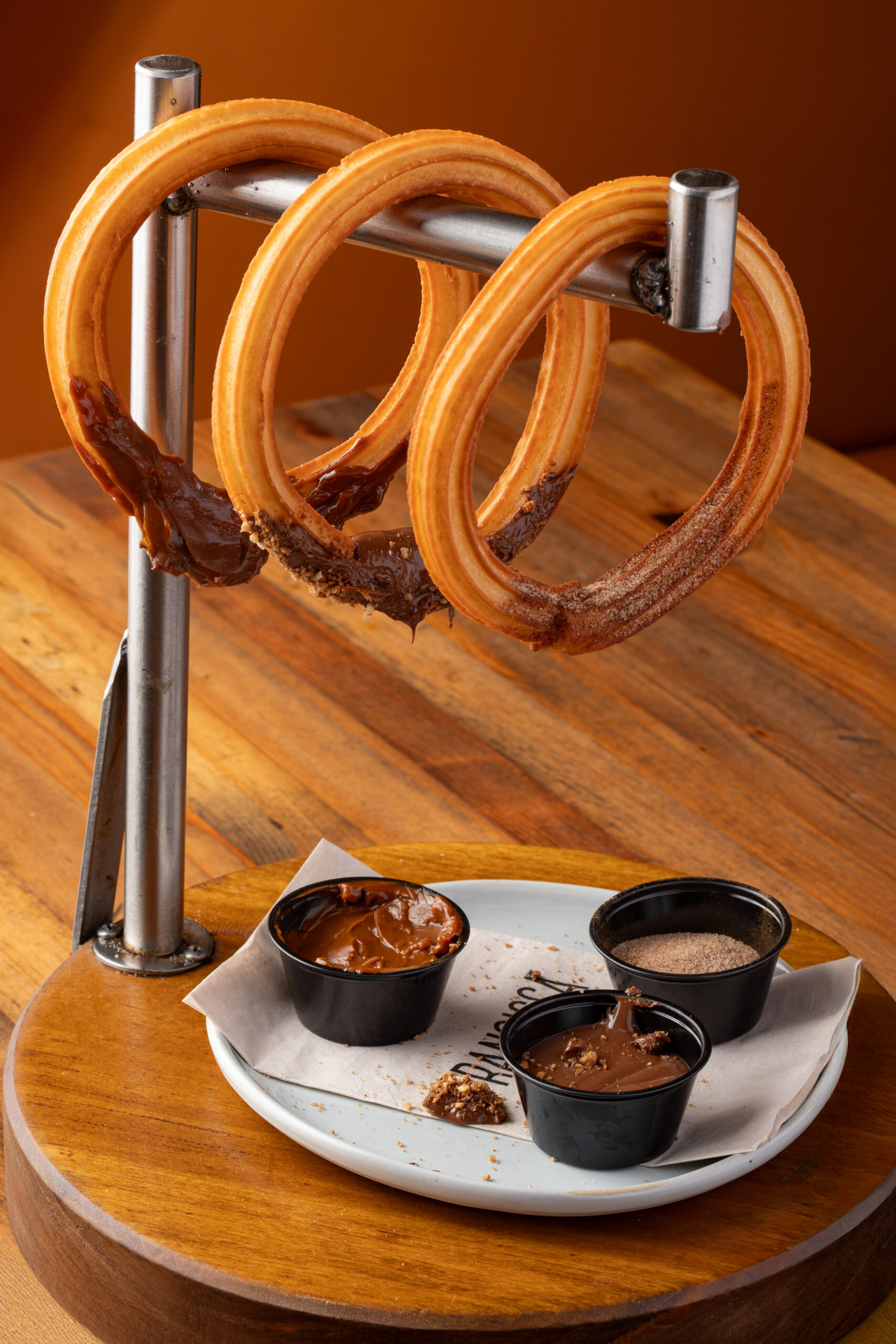 Churros loops on a metal stand with chocolate dips on a plate below.