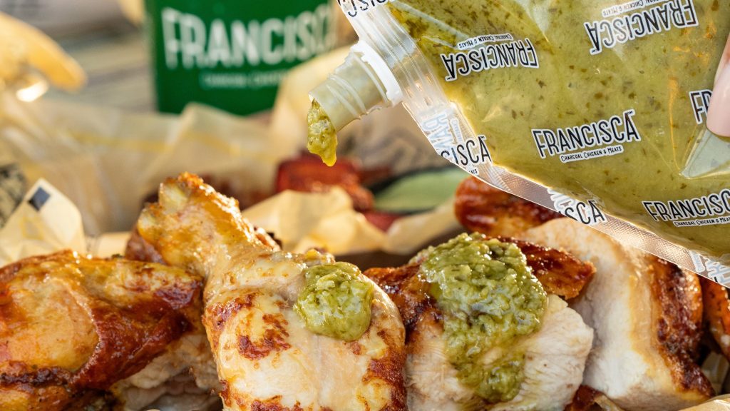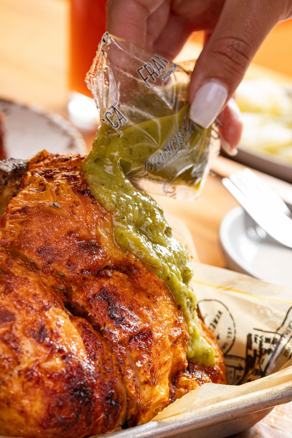 Close-up of roasted chicken pieces being topped with a squeeze of green sauce from a Francisca-branded packet, with additional sides blurred in the background.